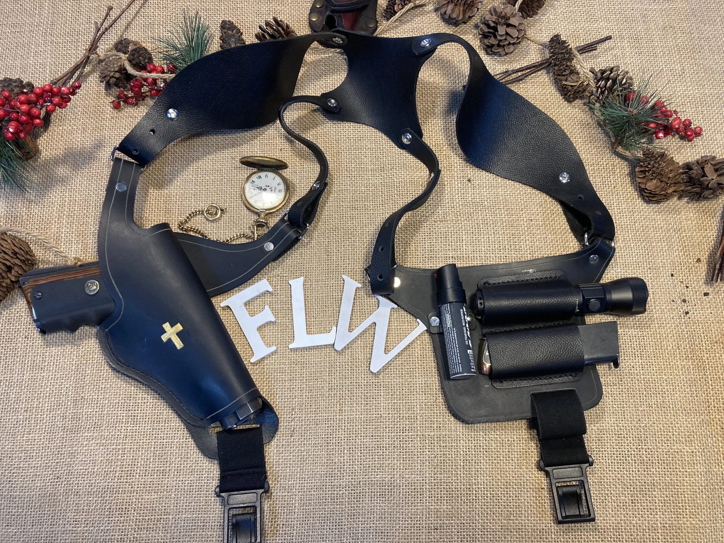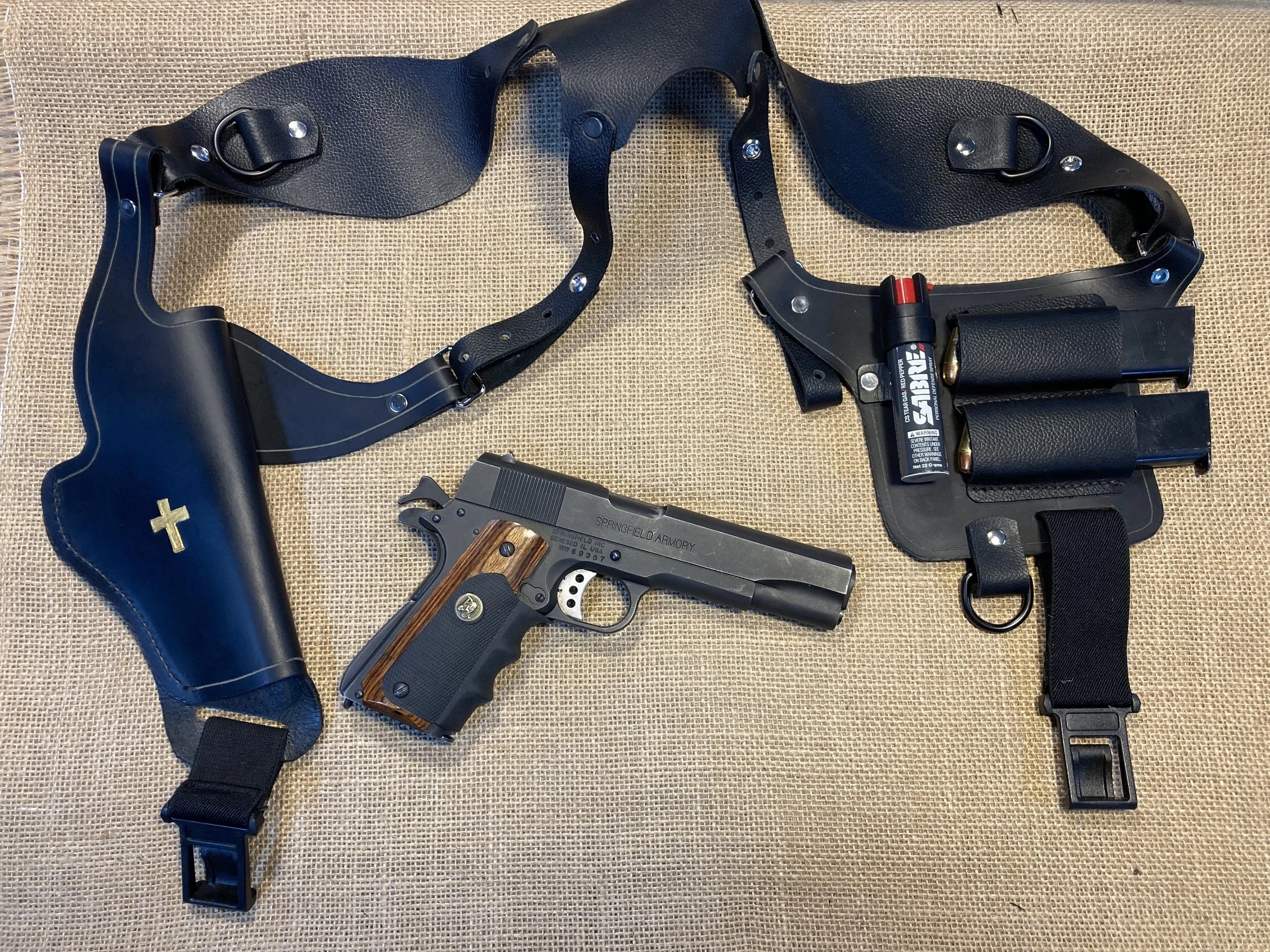 Looking to trade and or barter this beautiful Springfield 1911 A-1 .45 and Shoulder rig. Replace the Cross with your image or logo if you wish. Comes with 2 magazines…not the light or pepper spray. Photo to the left shows it will hold mags, light and Pepper Spray securely.