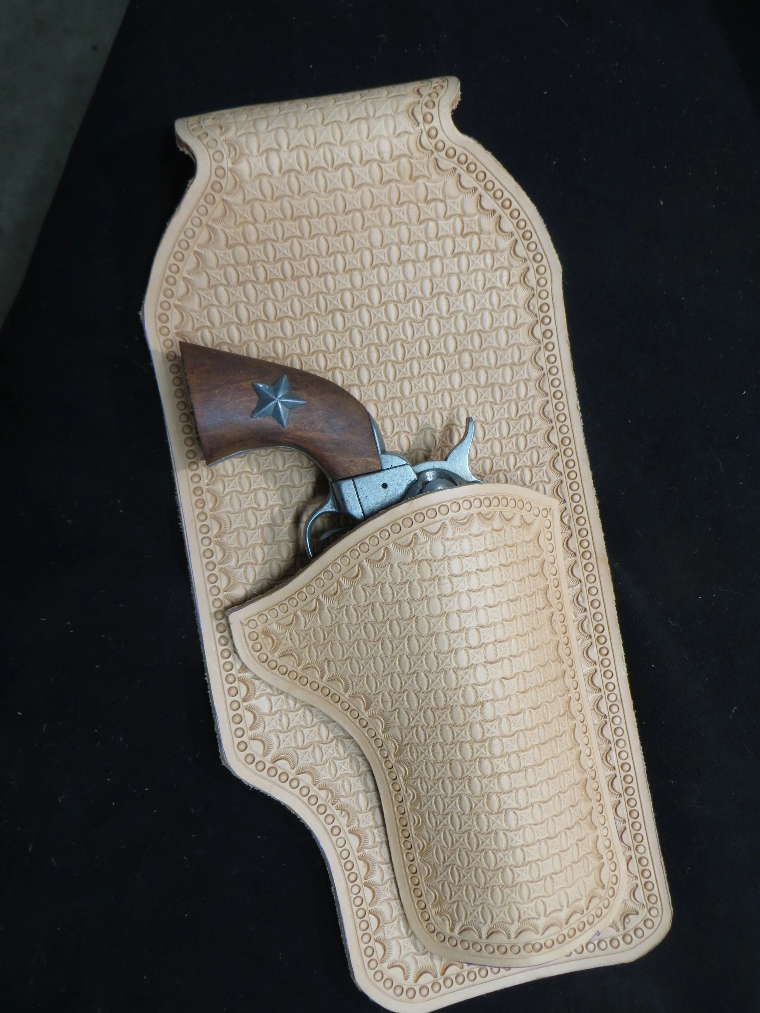 Frontier Leather Works designs and hand crafts each and every item you see on this site. All tooling design is hand done one stamp image at a time to insure uniqueness and quality of workmanship. The Pommell holster shown here is completely genuine thick suede lined. Straps over the saddle horn and is adjustable. All top grade leathers are used in all our products.