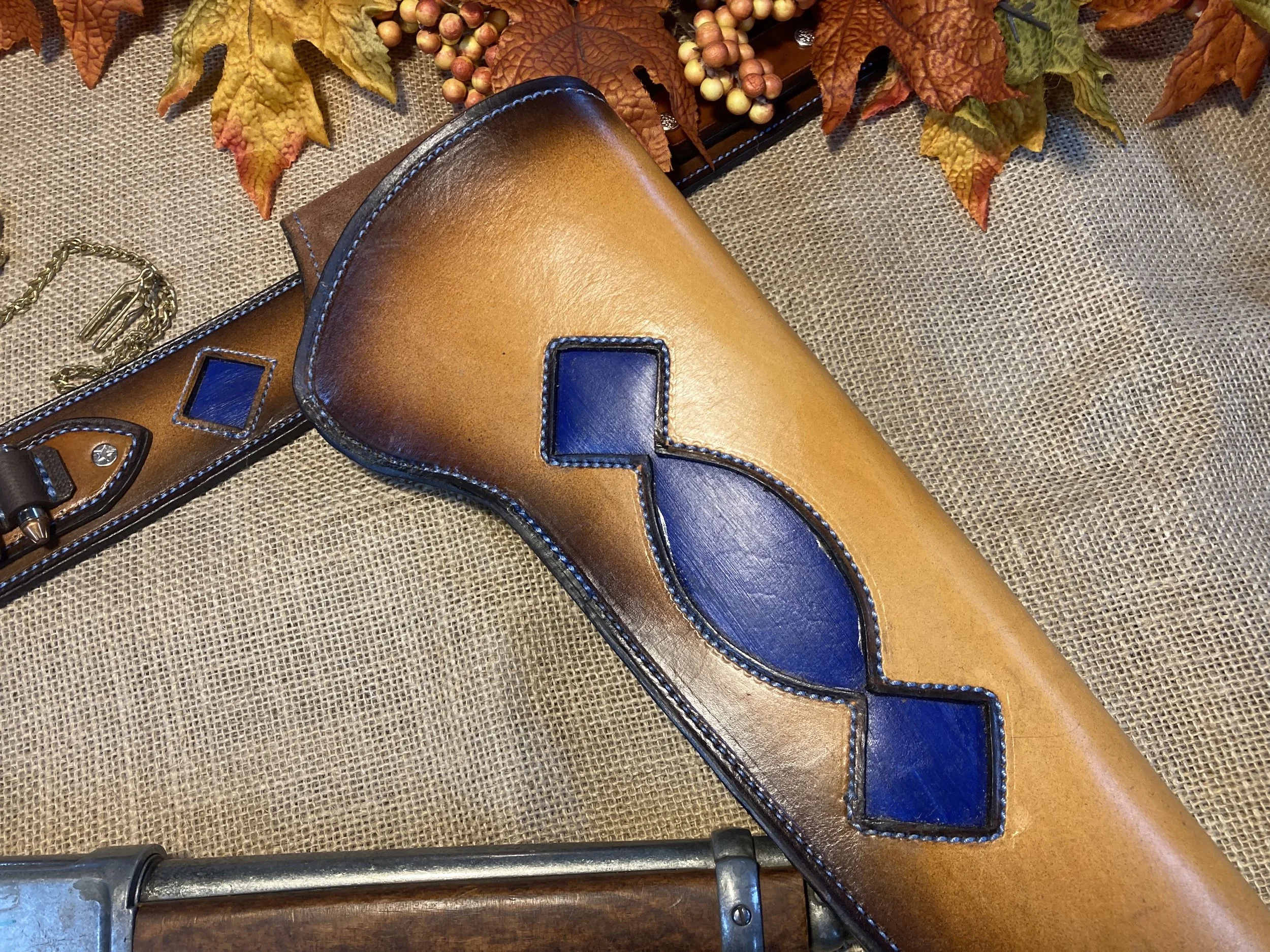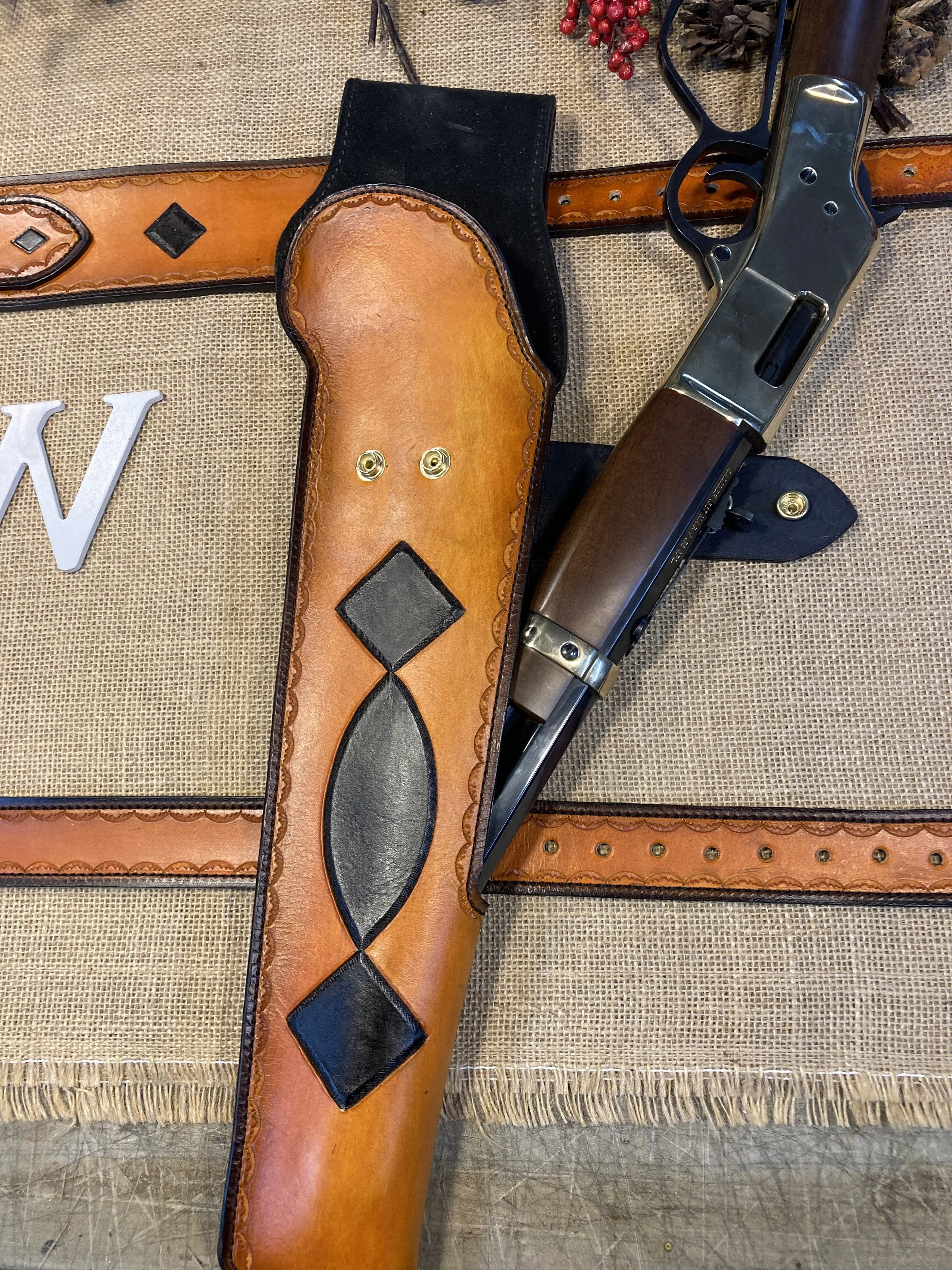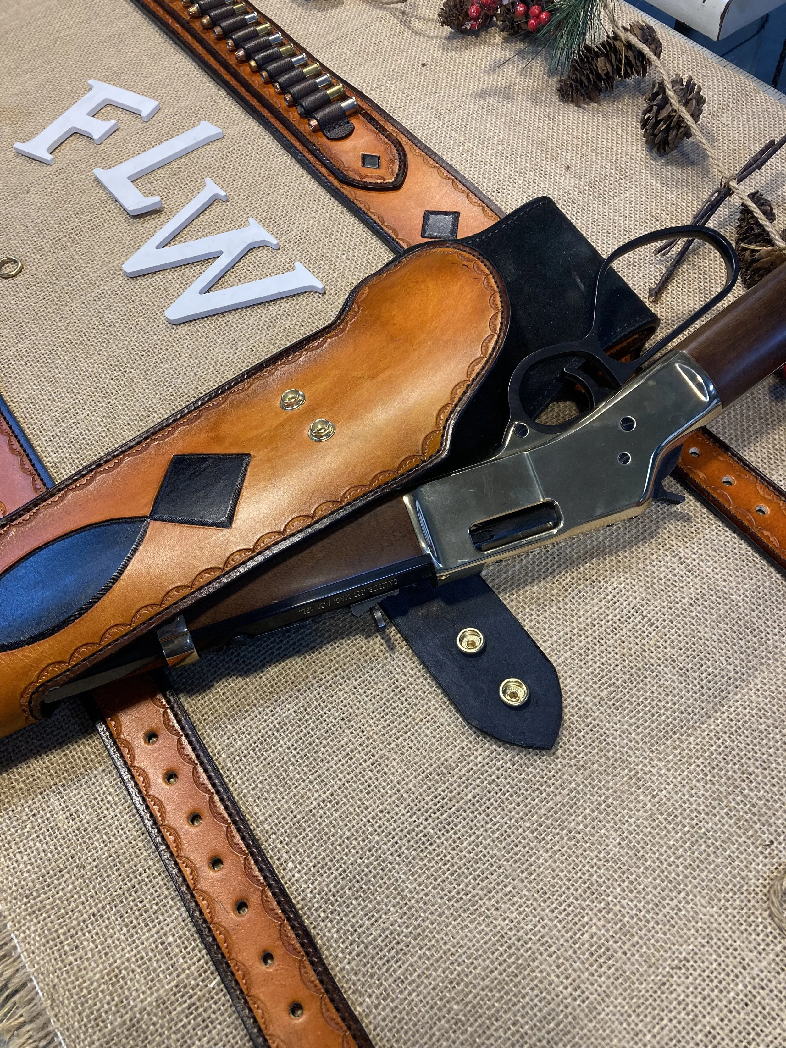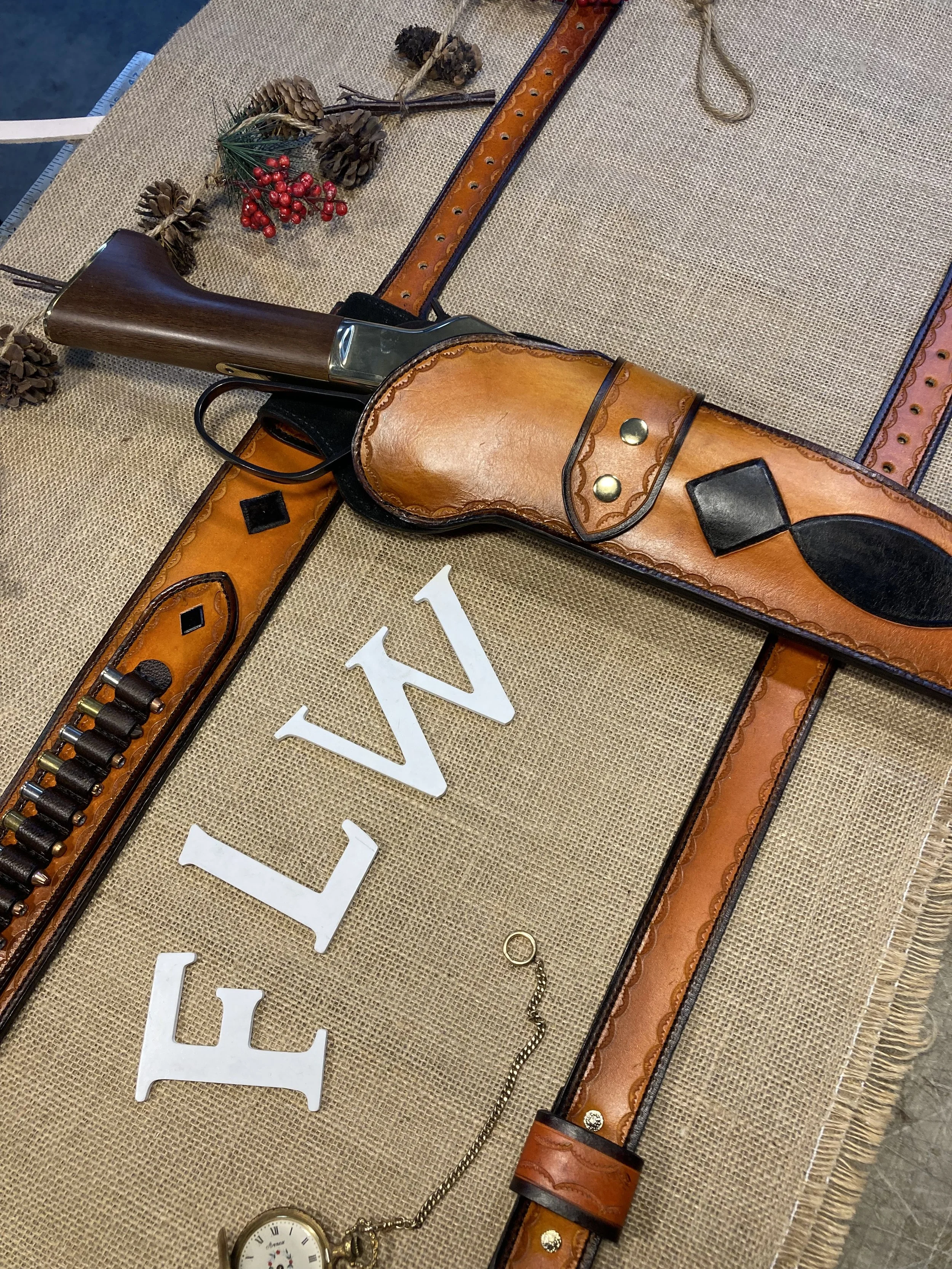 Frontier Leather Works customizes each Mares Leg (open or closed styles) to each cliet’s specifications. Here our client desired the Frontier Spider Web design with matching ammo belt. Have it your way. Give us your idea or design it yourself …we’ll help you step by step.