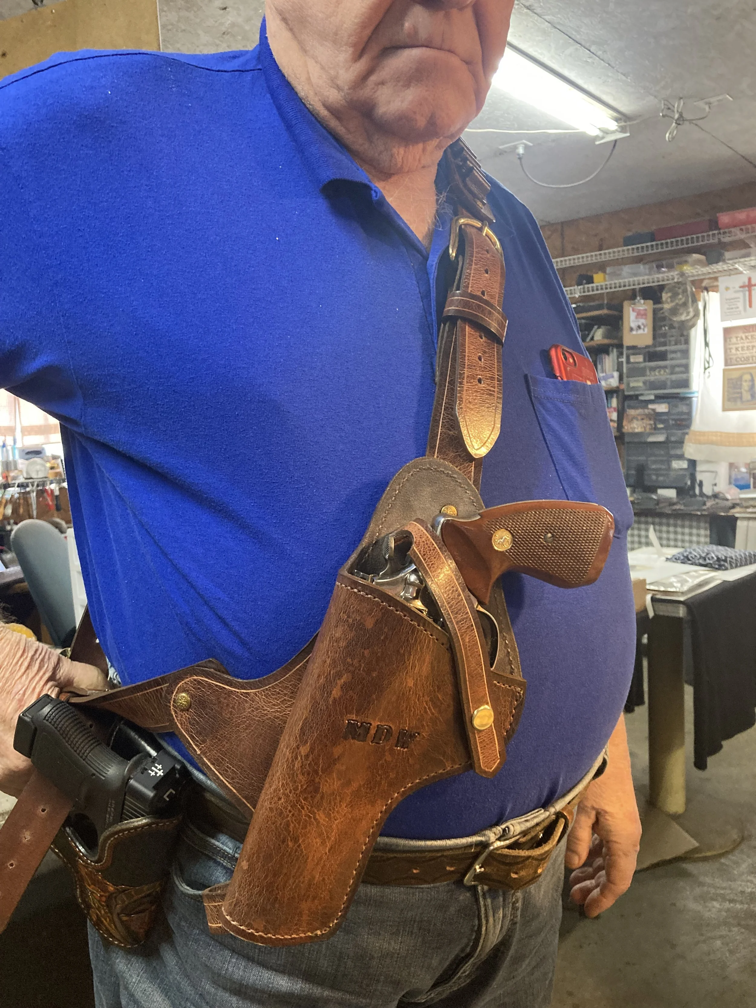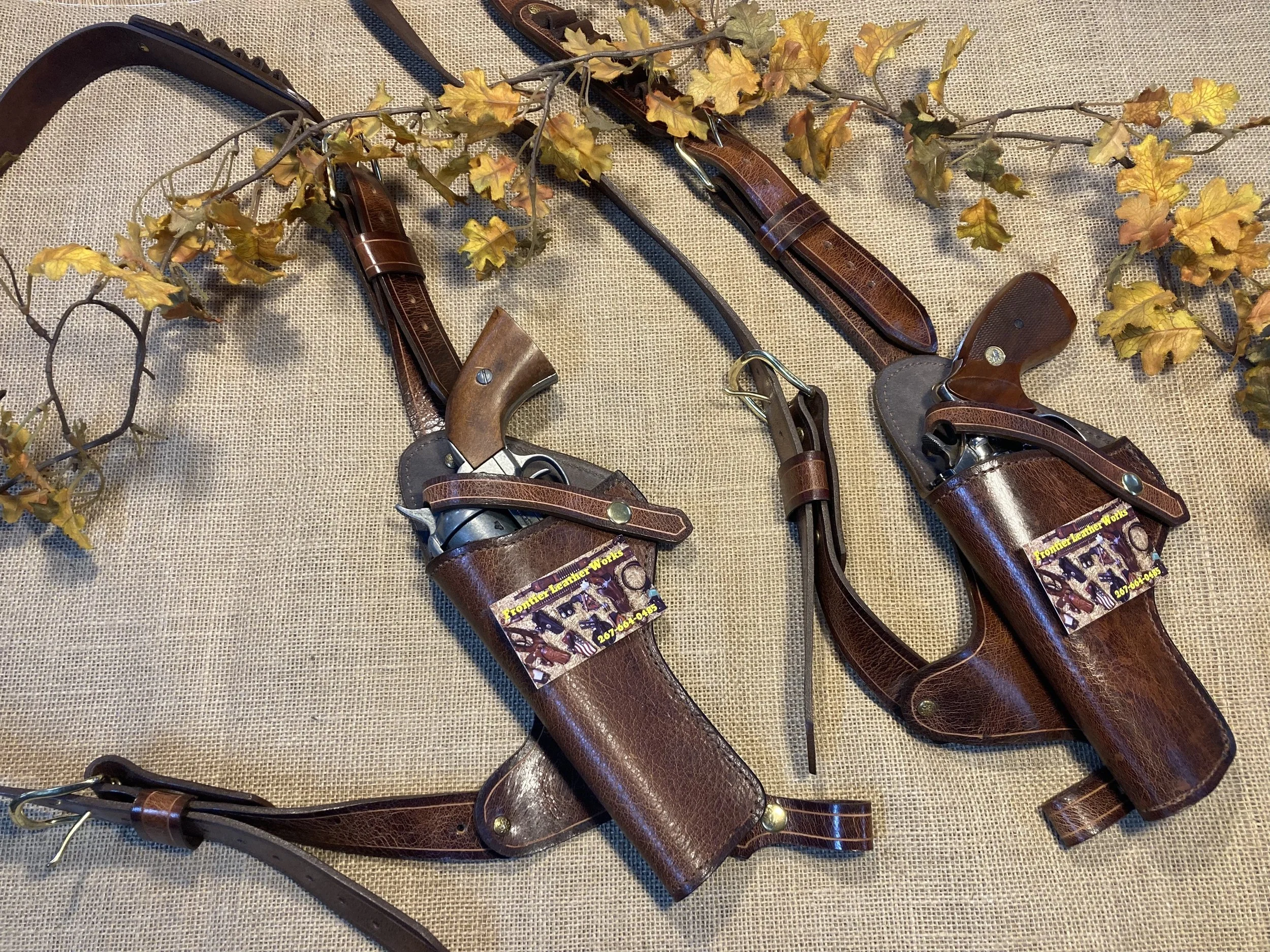 This unique, rugged western holster is made of American’s best leathers and will last more than a lifetime. Fits most every western pistol with up to 7 inch barrels. The floral concho in the center is beautiful as is the hand tooling down the side. The color gray is custom and cannot be repeated. A western belt in black can be made to compliment the holster if so desired for an additional cost. If interested in having a matching belt made contact leathercraftsman LT directly at 267-664-0485. This is the only holster of its kind. First come! FREE SHIPPING to any lower 48 states.