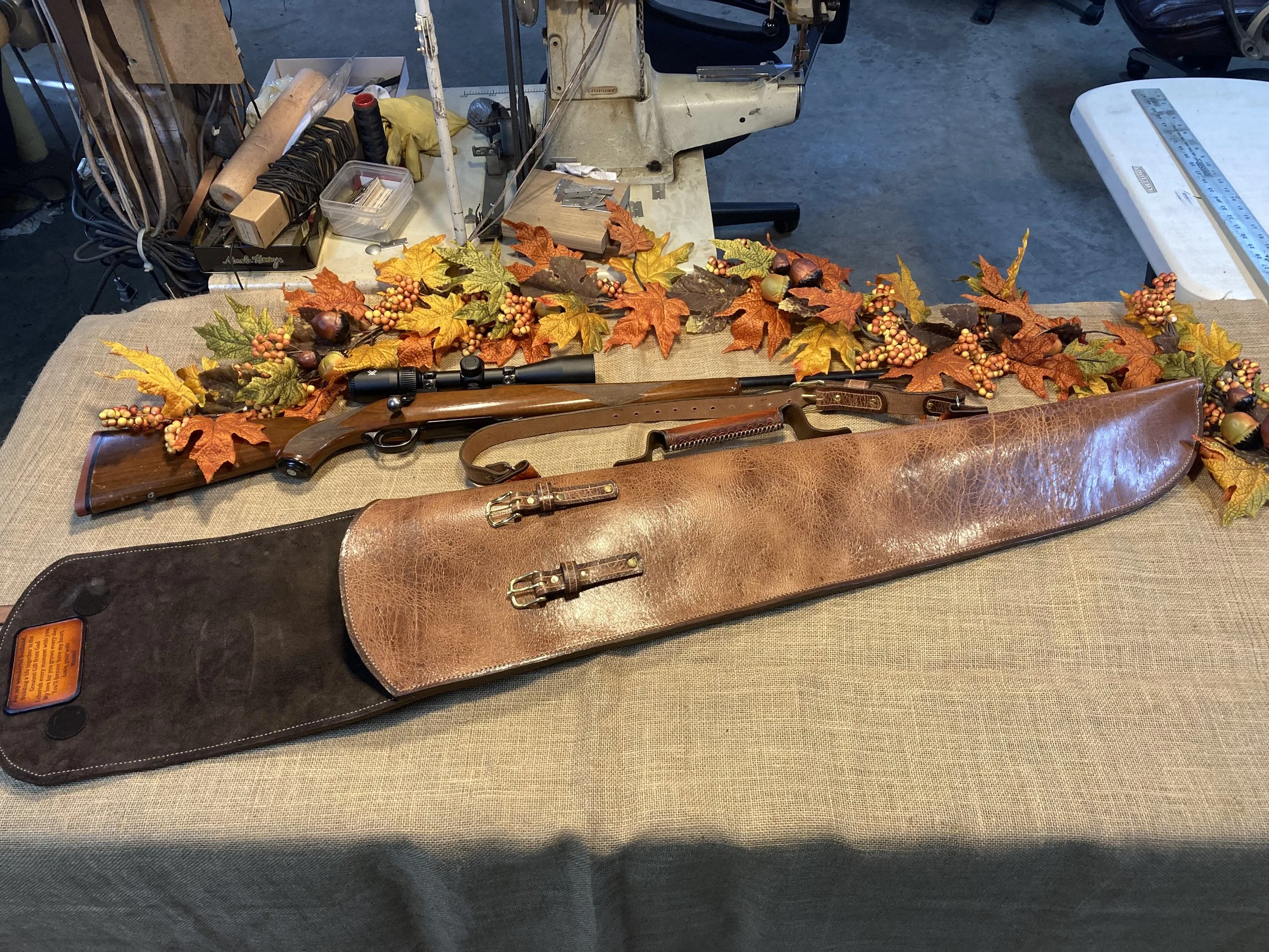 Can be custom made to your specifications and color. Made to fit your rifle, scope or not. Can be genuine suede lined or smooth lined.